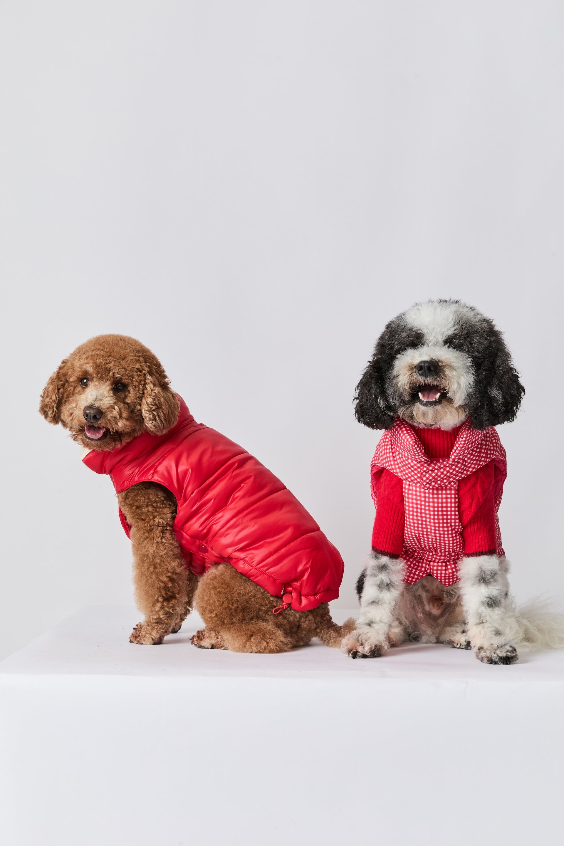 Our Gingham Puffer Jacket blends style and functionality. Made from recycled materials our eco friendly jacket not only looks great but contributes to a sustainable choice. Convenient side snap openings and velcro front tab makes it easy to dress your pup. The stand collar keeps your dogs neck cozy, while the elastic details at the belly and cinched hem allow for an adjustable fit. Theo is wearing size M