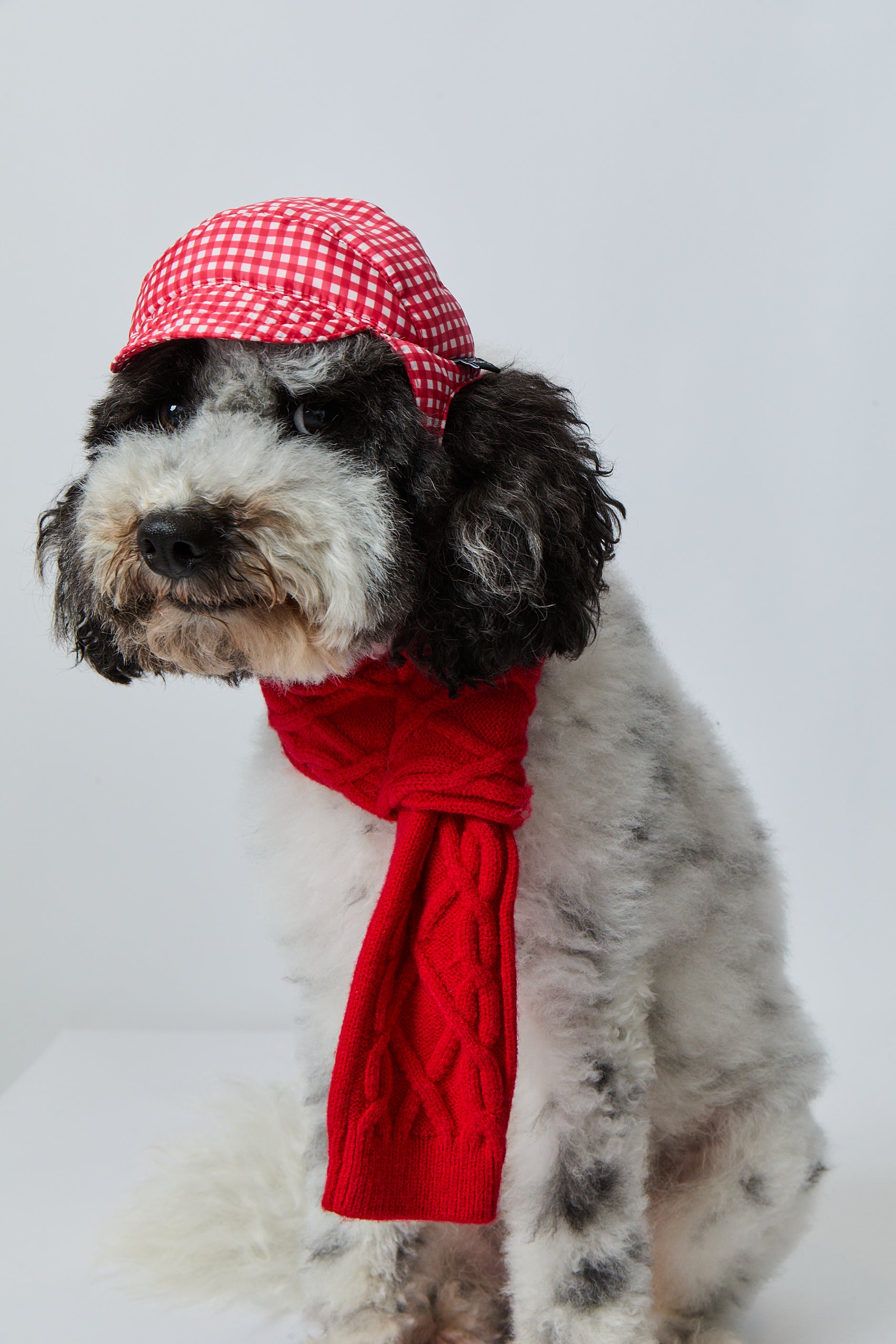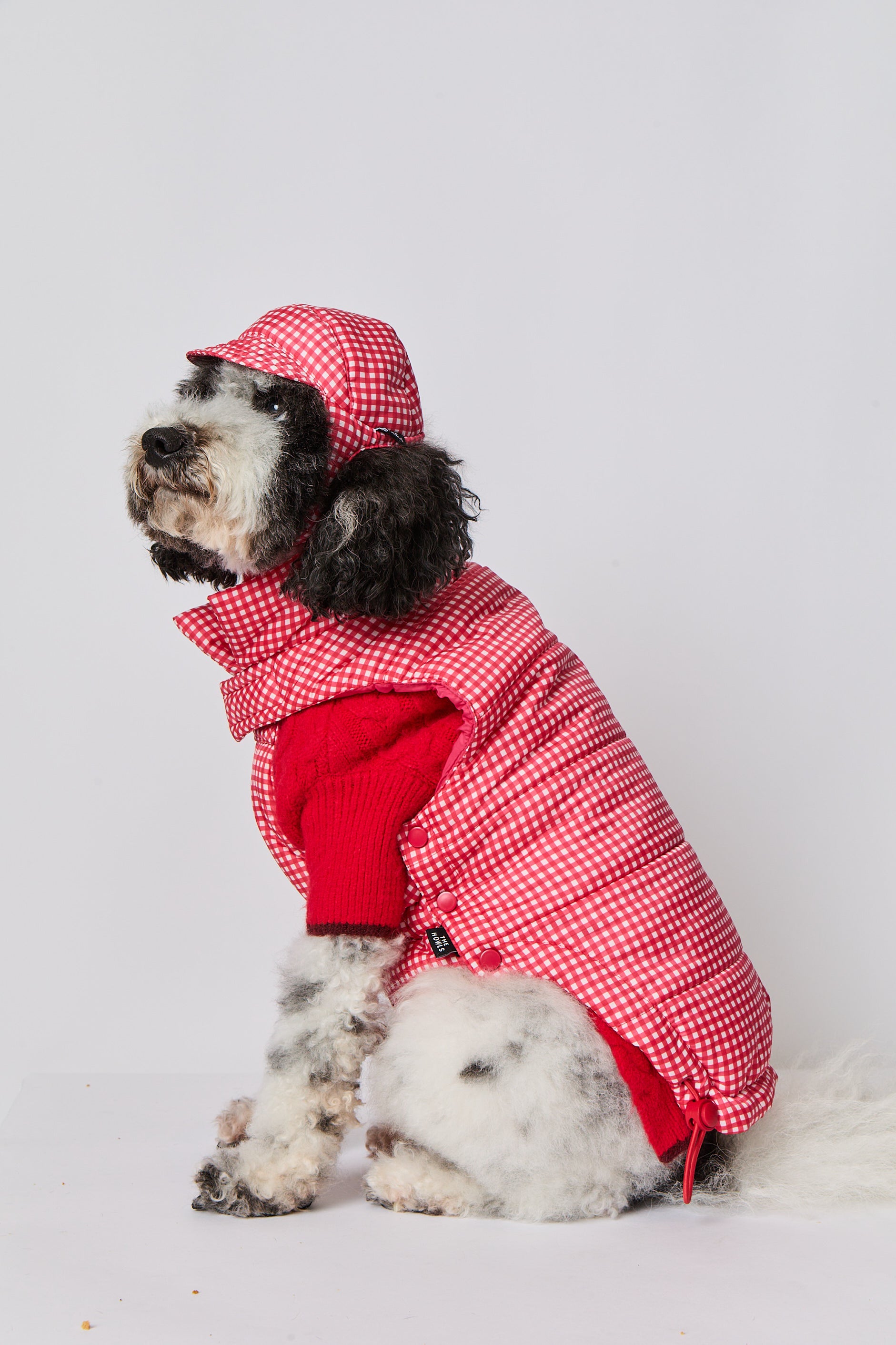 Keep your pup's head cozy and cute on cold days. Our stylish Gingham Puffer Hat is made from recycled materials, with vegan alternative fill making a sustainable choice. Convenient adjustable chin strap and ear keyhole. Try a matching set with the Gingham Puffer or mix with Core Puffers, scarfs and sweaters! Nico and Theo are wearing size M